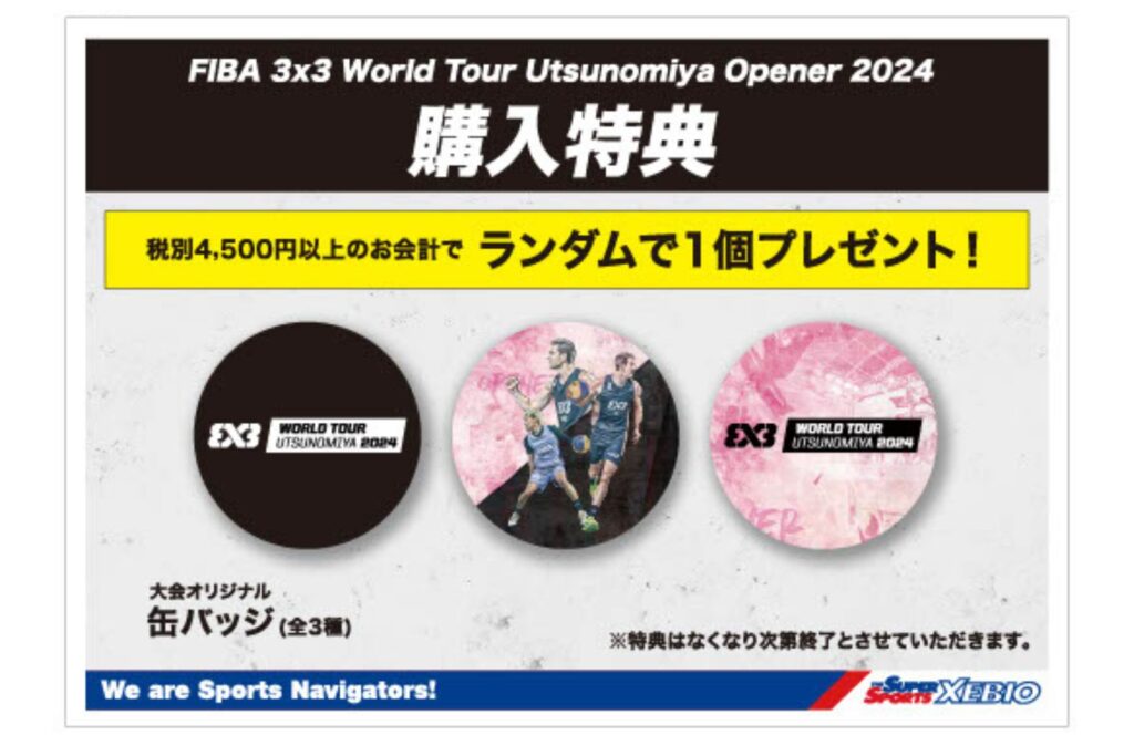 「FIBA 3×3 UTSUNOMIYA OPENER 2024」公式グッズを 税別4,500円以上 お買い上げいただいた方にオリジナル缶バッチをプレゼントいたします!